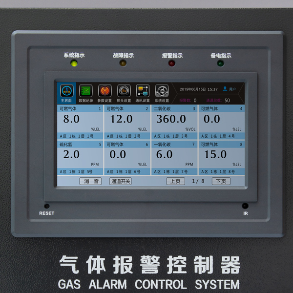 - d) 通過觸摸屏操作系統菜單,巡檢主顯示屏顯示測量氣體濃度值、報警信息、故障信息、系統操作日志、各通道氣體所有參數信息(如氣體名稱,量程,報警值等);